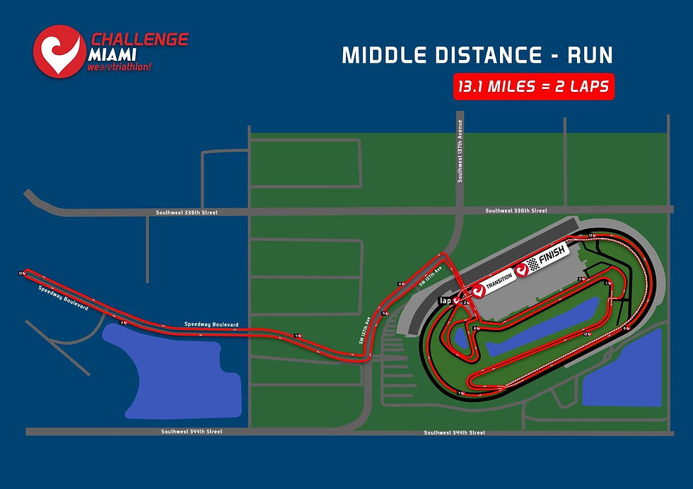 I loved the idea of racing on a NASCAR track. I've ridden the track a few times at other events and I knew the speedway was a perfect venue for a triathlon of this caliber. A middle distance, or half ironman race consists of 1.2 miles of swimming, 56 miles of cycling and a half marathon (13.1 miles) in that order. Check out the race maps from Challenge Miami below. You'll notice that each discipline required 2 laps and that the entire swim, about half the run, and a portion of the bike course were all within the track.